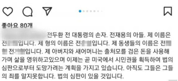 자신을 전두환 손자라고 소개하며 전두환과 그의 아들 전재용의 죄를 폭로하는 글이 인스타그램과 유튜브를 통해 올라온 상황인데요. 전두환의 손자라고 소개한 전우원씨는 SNS를 이용하여 전두환 아들 가족 형제 지인들의 범죄 목록과 얼굴, 실명 등을 모두 올려 폭로를 하였으며 자신 역시 처벌을 받길 원한다는 글을 올렸습니다.