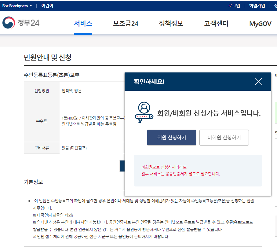 발급 버튼을 누르면 회원 또는 비회원 신청이 가능하다고 나오며 회원 신청하기를 누르면 로그인 화면으로 넘어갑니다.