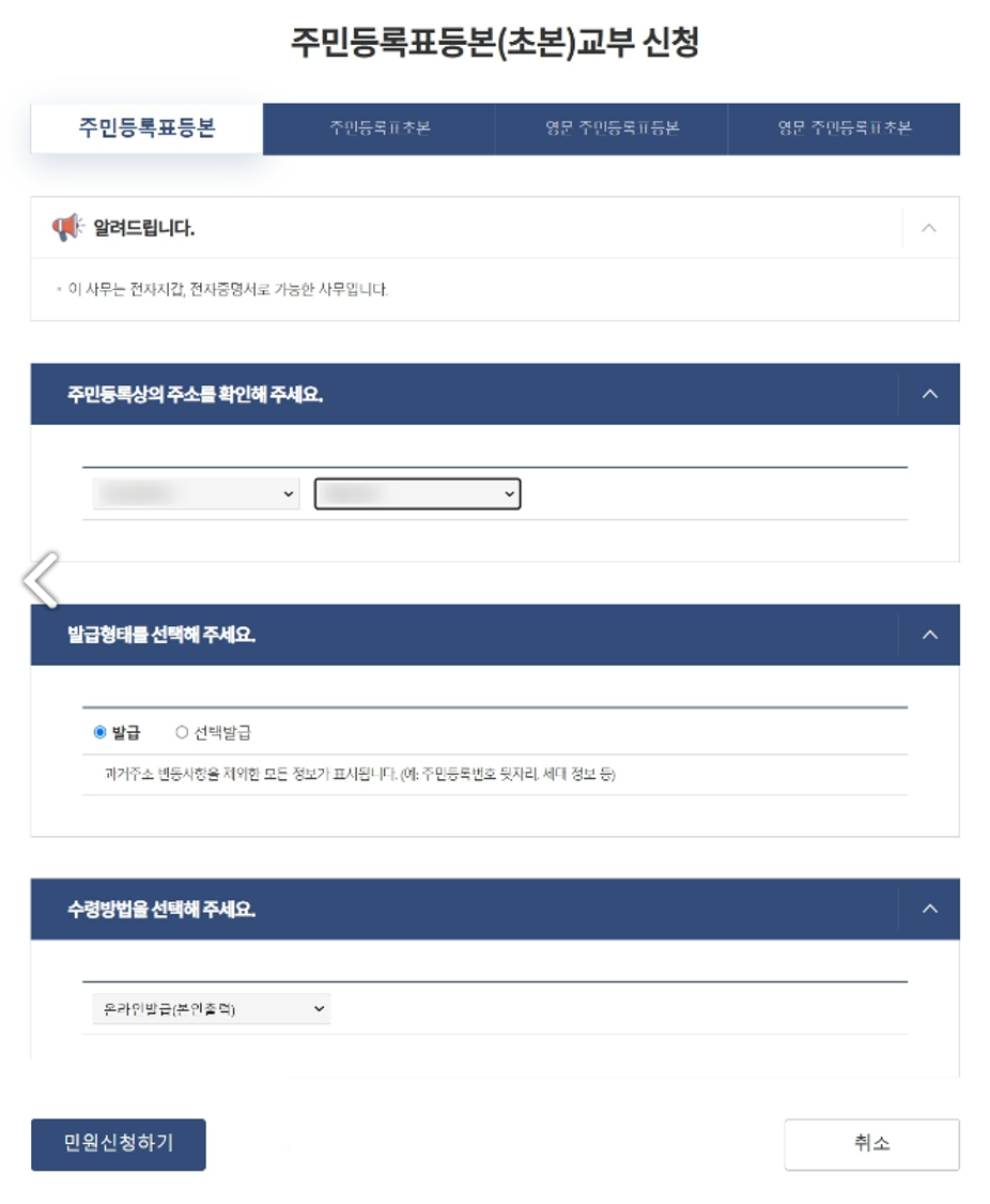 인증을 하고 접속하면 주민등록등본(초본)교부 신청서 화면으로 넘어갑니다. 이때 해당하는 시와 구를 선택한 후에 발급혈태를 발급으로 하고 온라인발급으로 수령방법을 선택한 후에 민원신청하기를 클릭하시면 됩니다.