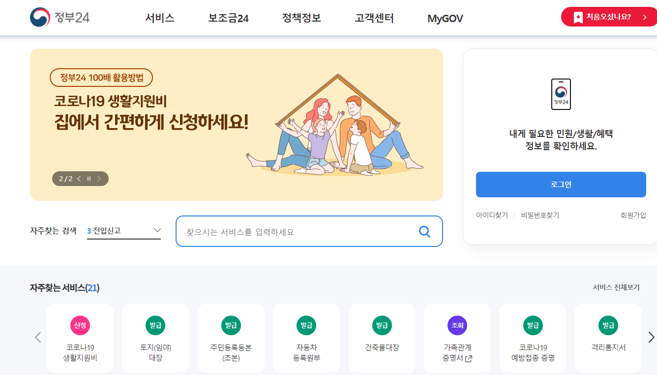 정부24에 접속하여 메인 화면을 보시면 자주 찾는 서비스를 보실 수 있는데