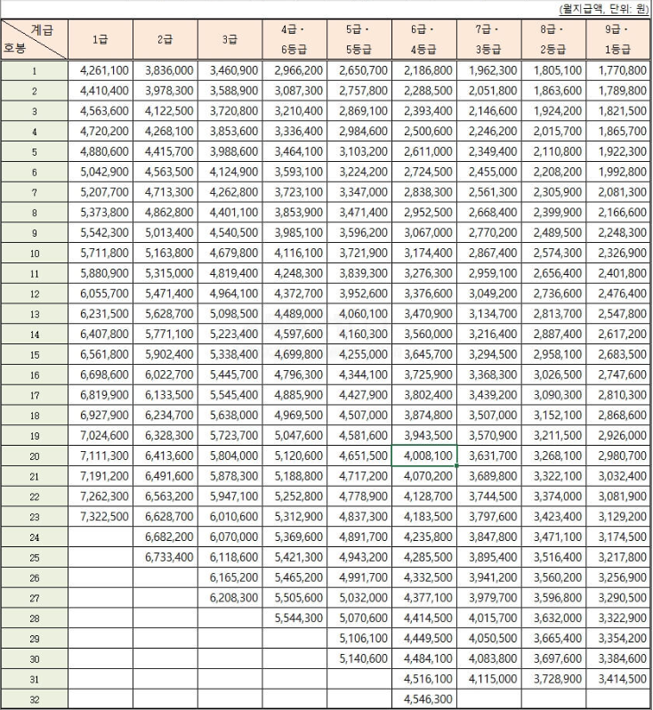대부분의 공무원분들에게 해당되는 일반직 공무원 봉급표입니다.