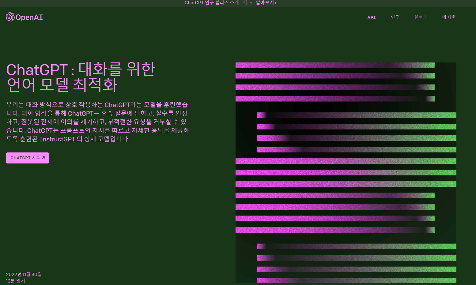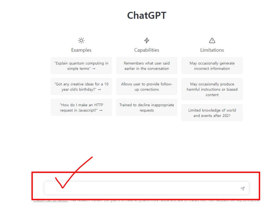 ChatGTP 홈페이지에 접속하면 메인 화면을 보실 수 있는데요. 다만 본격적으로 이용하기 위해서는 먼저 회원가입을 해주셔야 합니다!